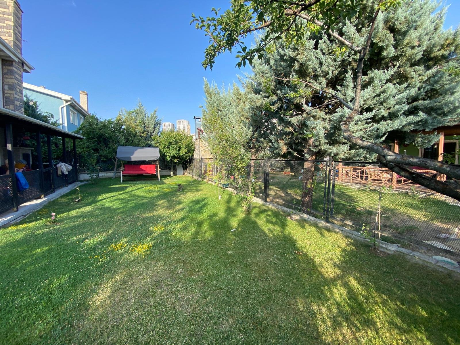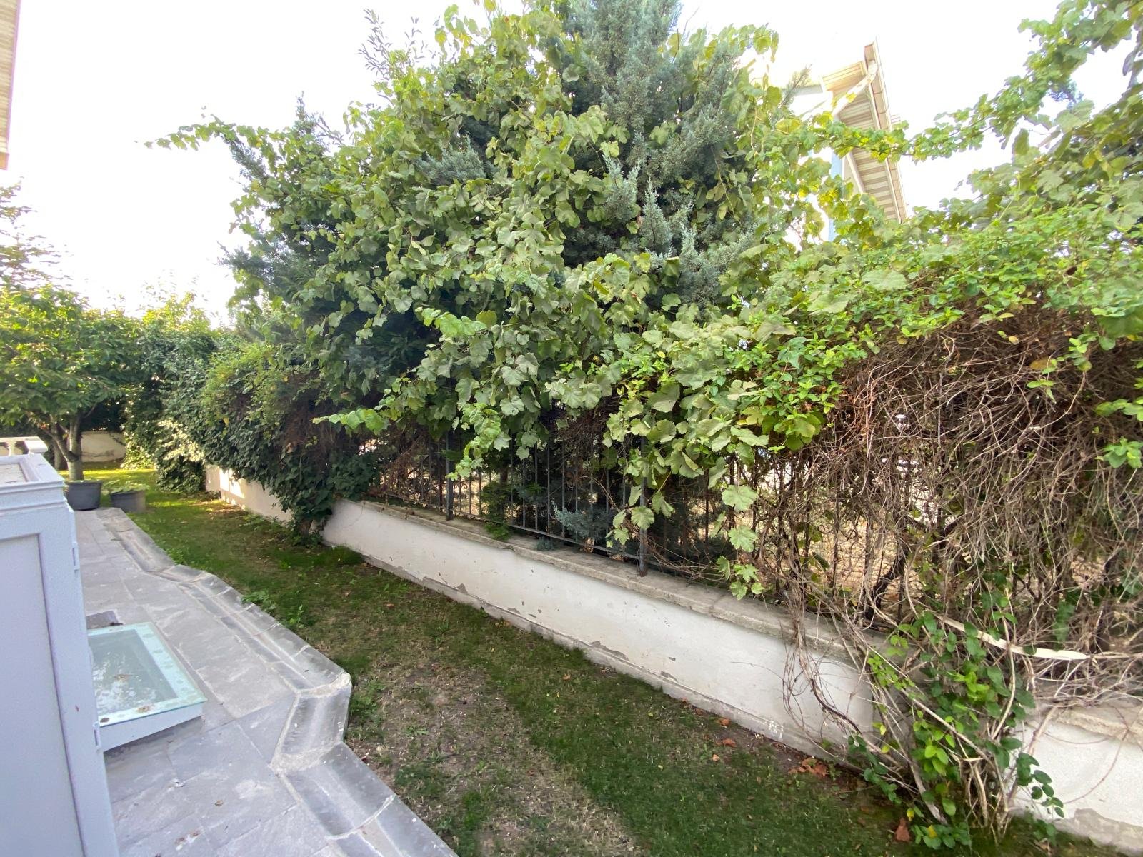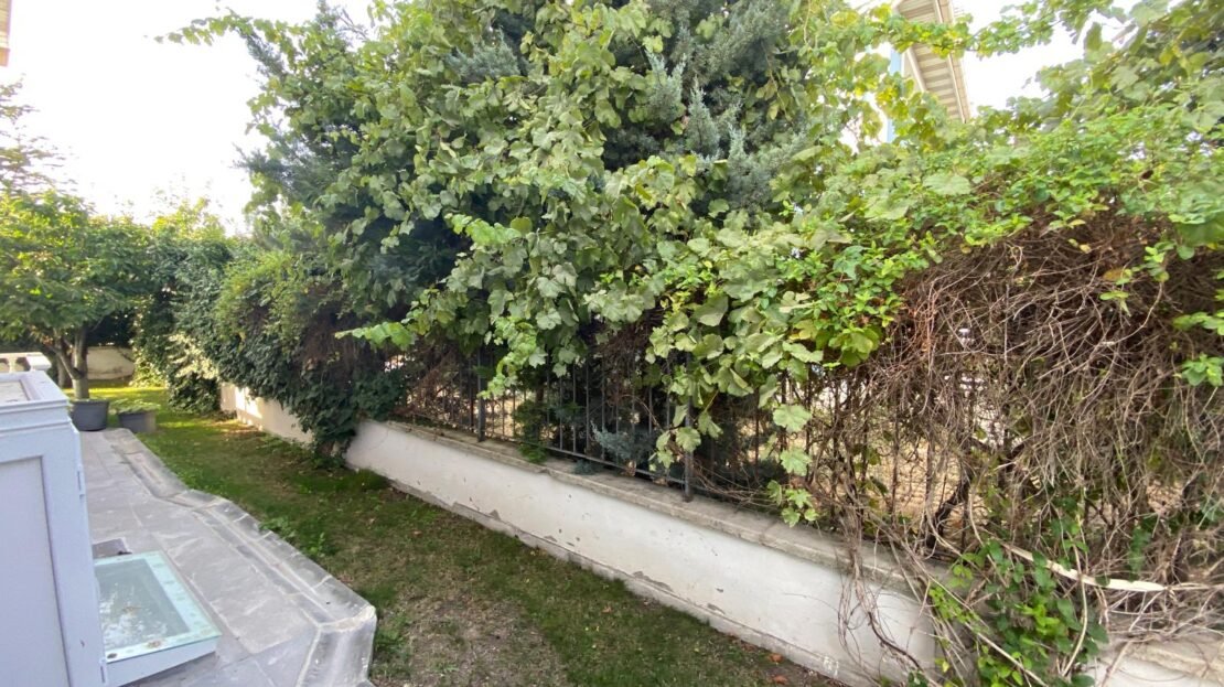 - Bakımlı peyzaj düzenlemesi, meyve ağaçları ve geniş çim alanı