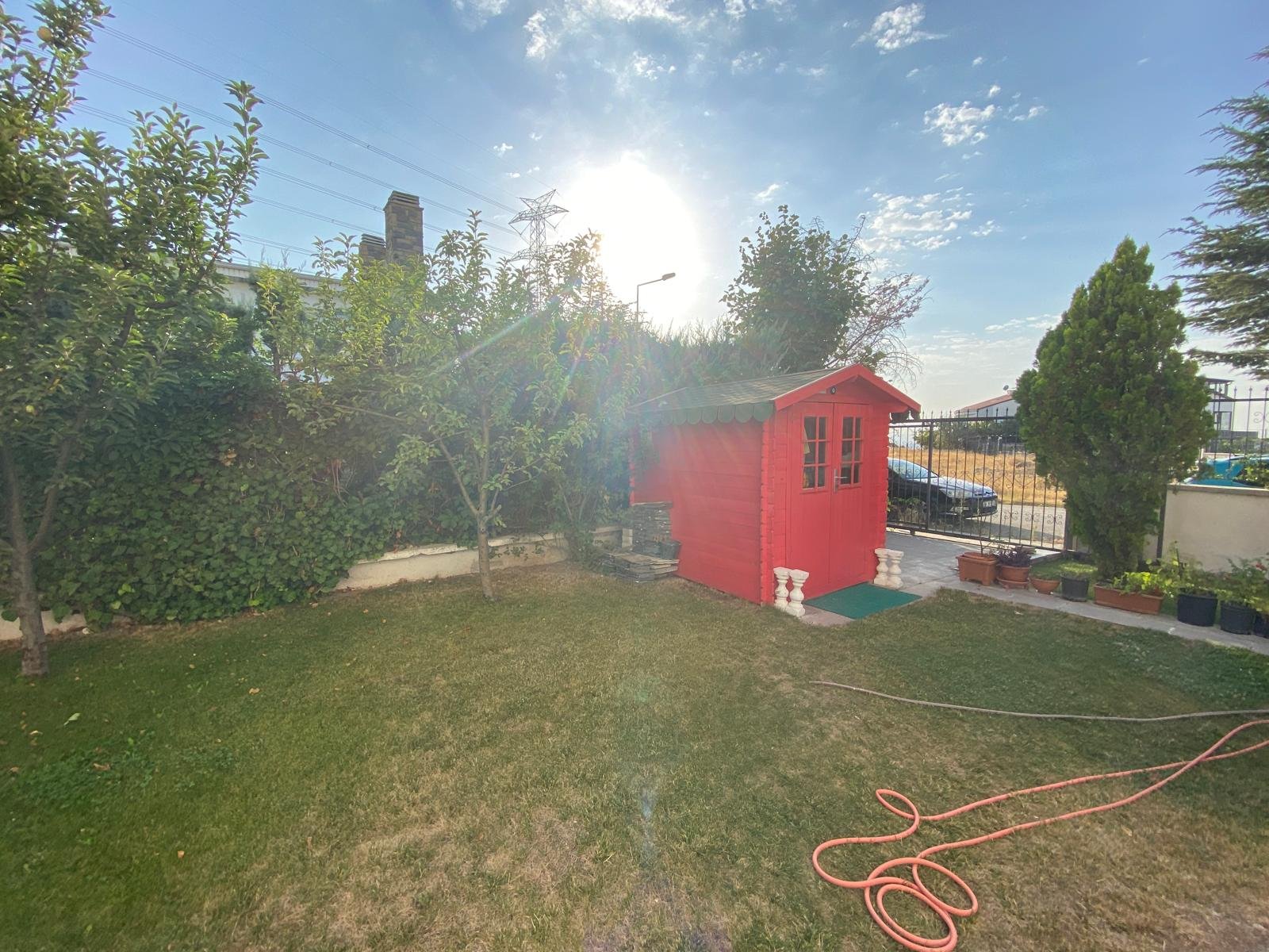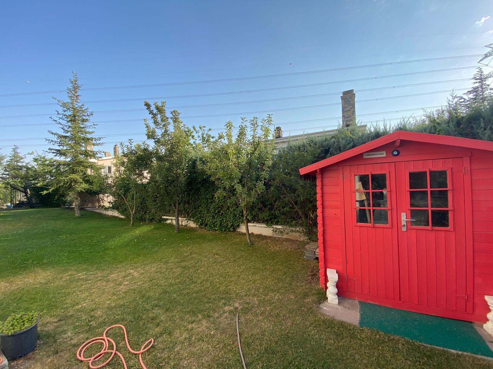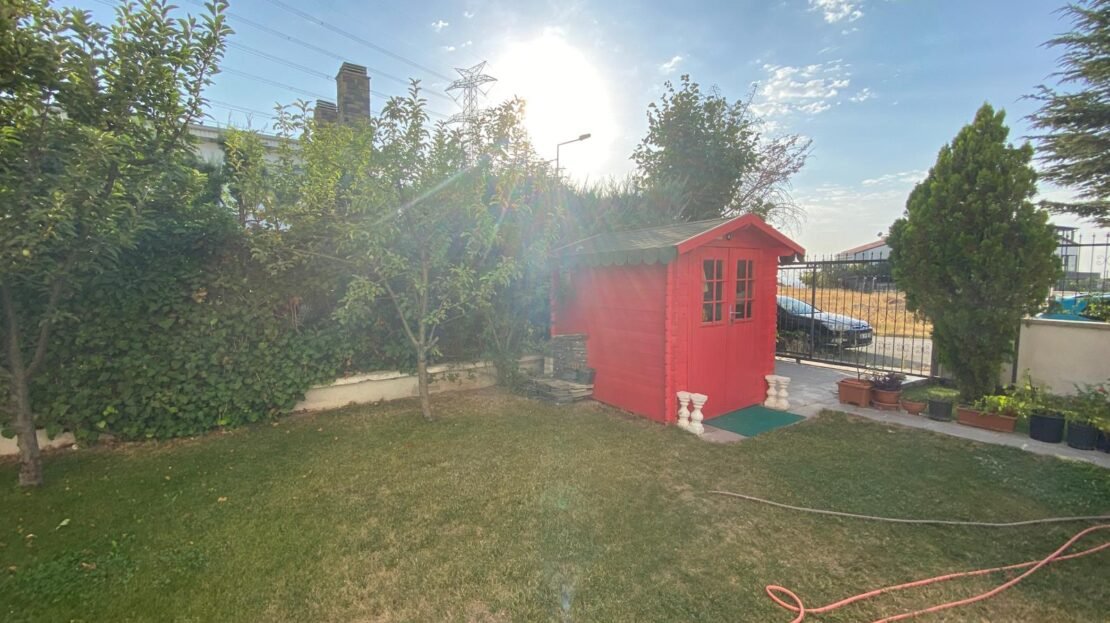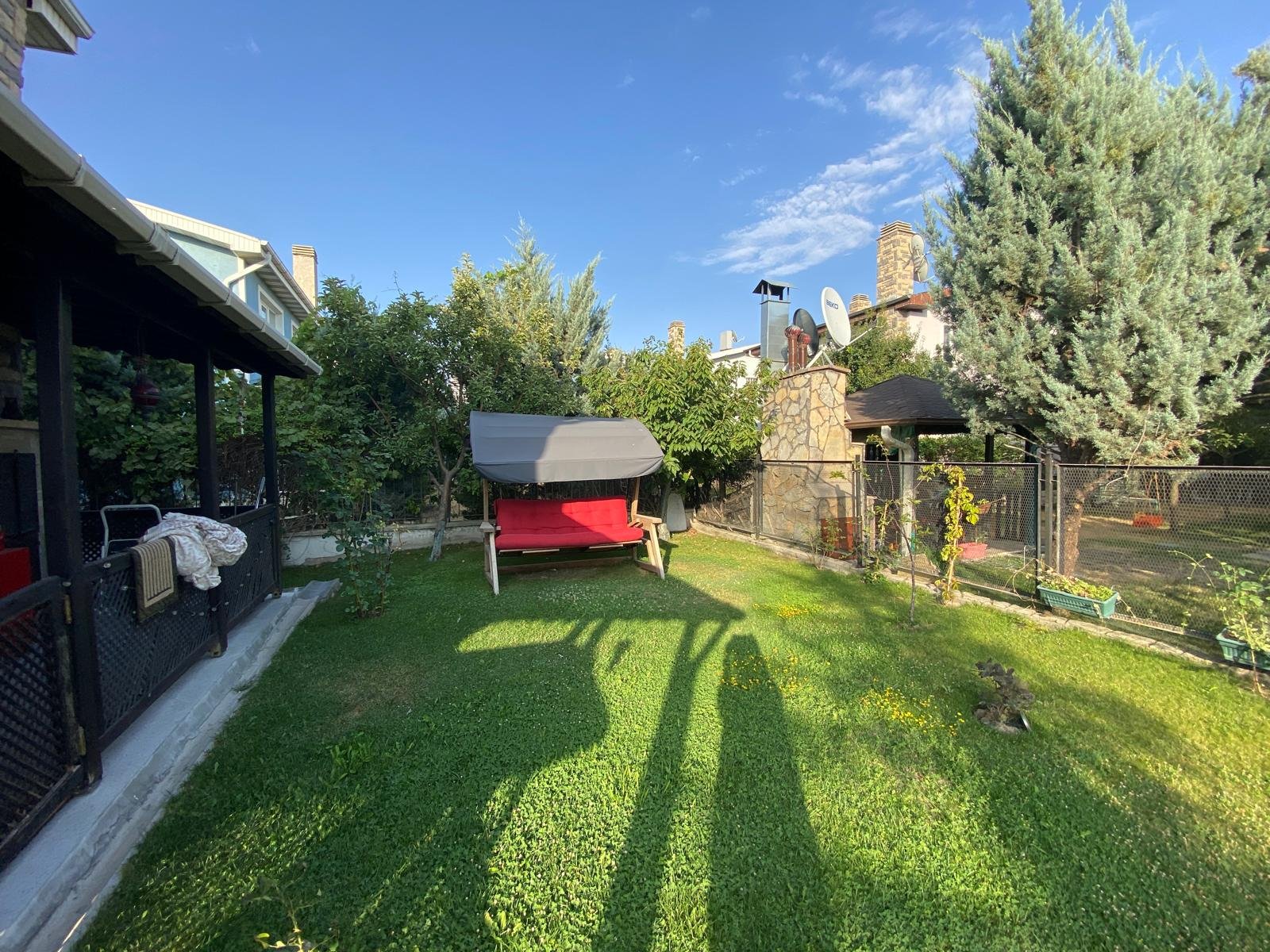 - Bakımlı peyzaj düzenlemesi, meyve ağaçları ve geniş çim alanı